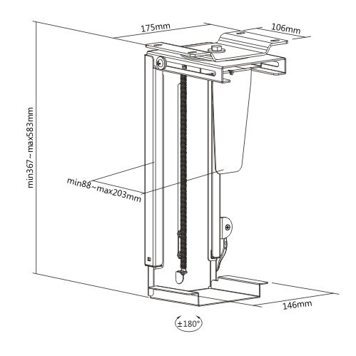 Sustine unitatea centrala a PC-ului, evitand praful sau murdaria, lasand in acelasi timp spatiu pentru curatare si aspirare sub birou. Cu un maner usor de blocat, acest suport asigura o montare sigura la orice inaltime dorita. Inaltimea si adancimea reglebile garanteaza compatibilitate cu majoritatea dimensiunilor si formelor de carcasa PC. Reglarea rotativa la 360 ° ofera acces facil la porturi si cabluri. Instalarea este usoara, fara efort.