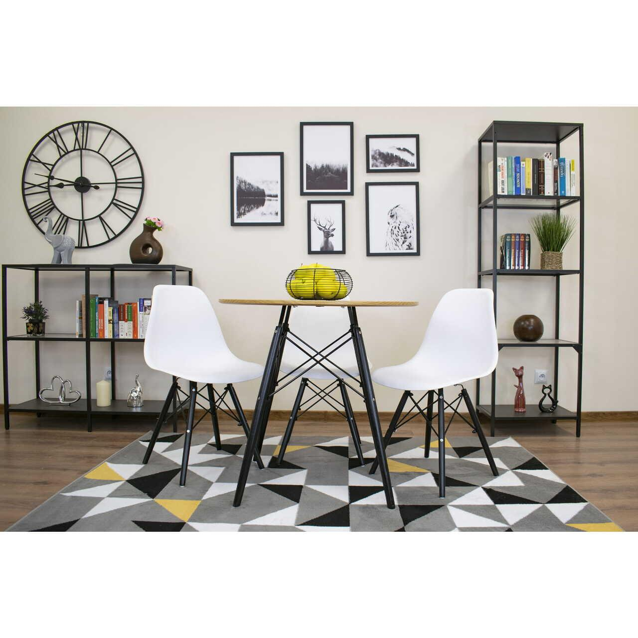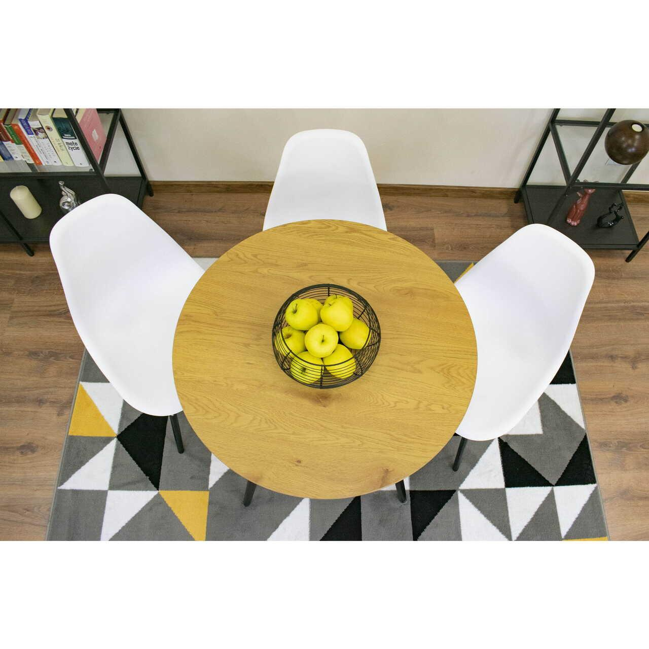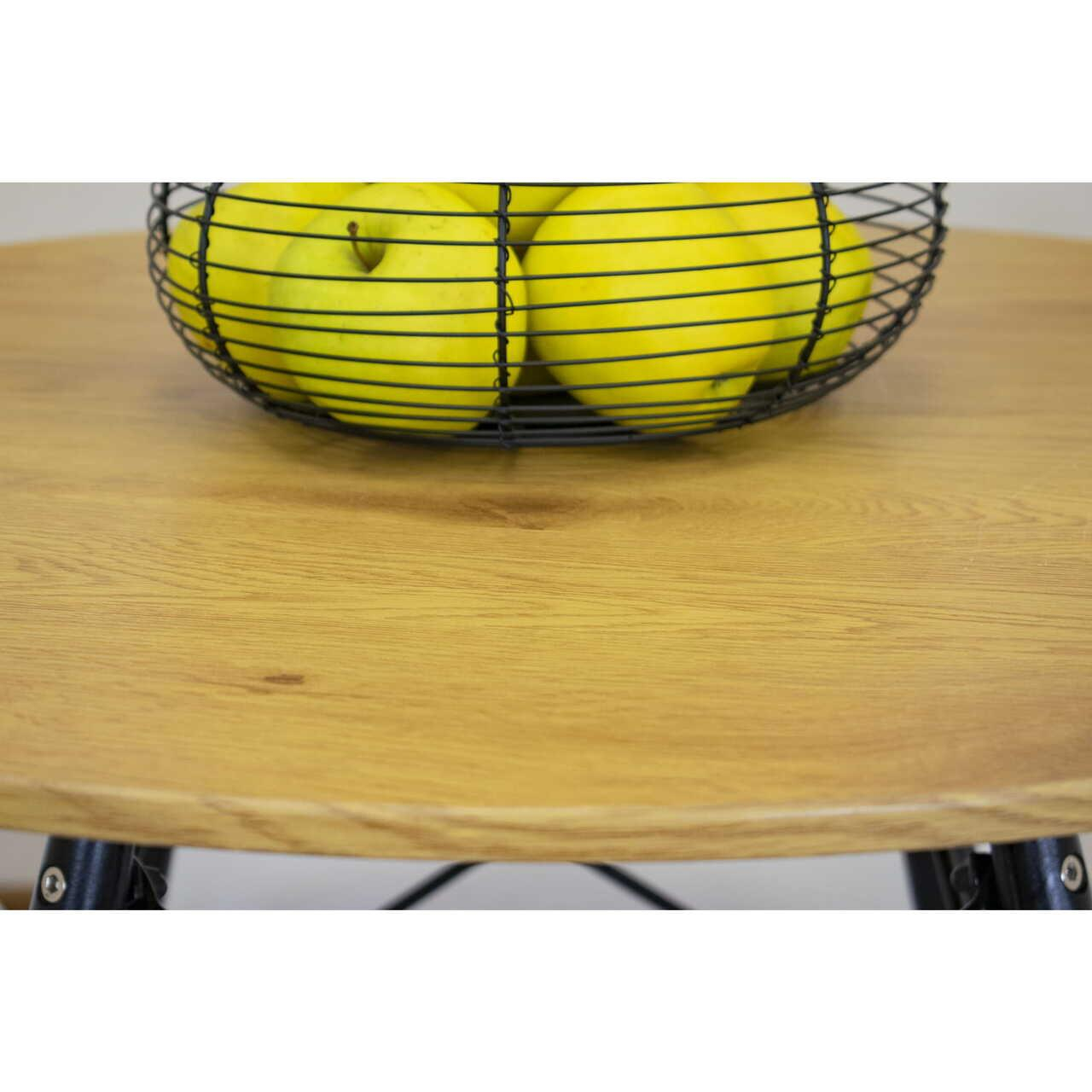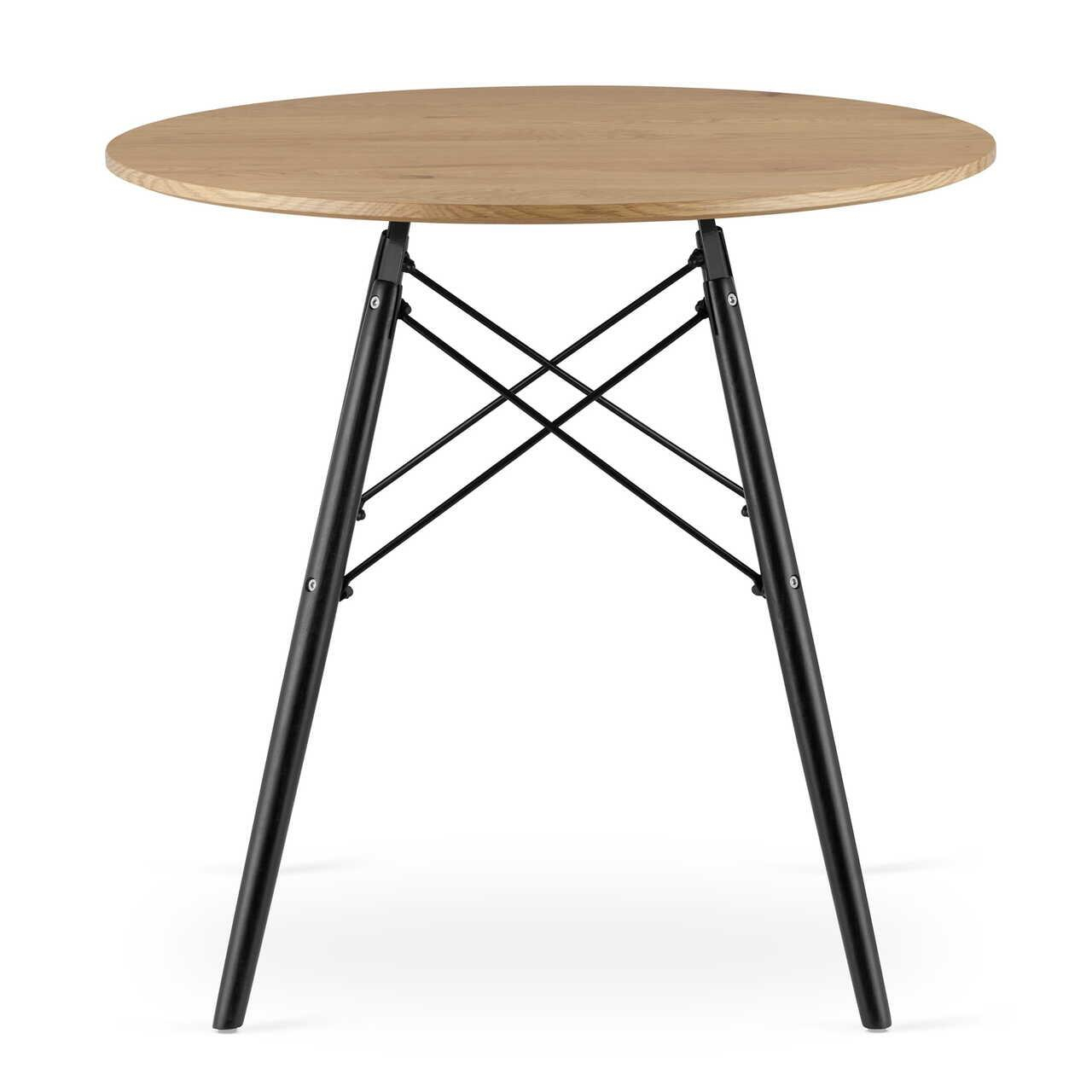 Masa are un blat MDF cu o grosime de 18 mm si un cadru din otel, iar picioarele sunt solide din lemn de fag. Diametrul mesei este de 80 cm, inaltimea ei fiind 70 cm.