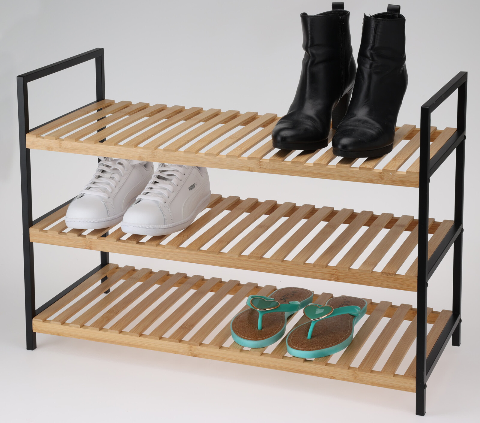 Suport pentru Pantofi cu 3 Nivele, Rafturi din Bambus și Cadru Metalic,Negru