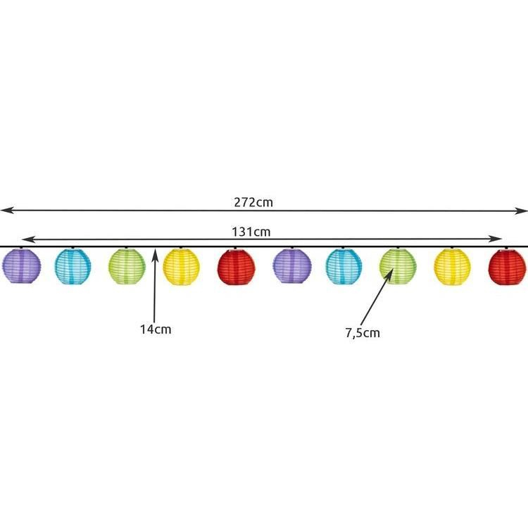Siragul de becuri tip ghirlanda are o lungime totala de 3 m si beneficiaza de 10 de becuri cu diametrul de 7.5 cm fiecare. Distanta dintre becuri este de 14 cm.