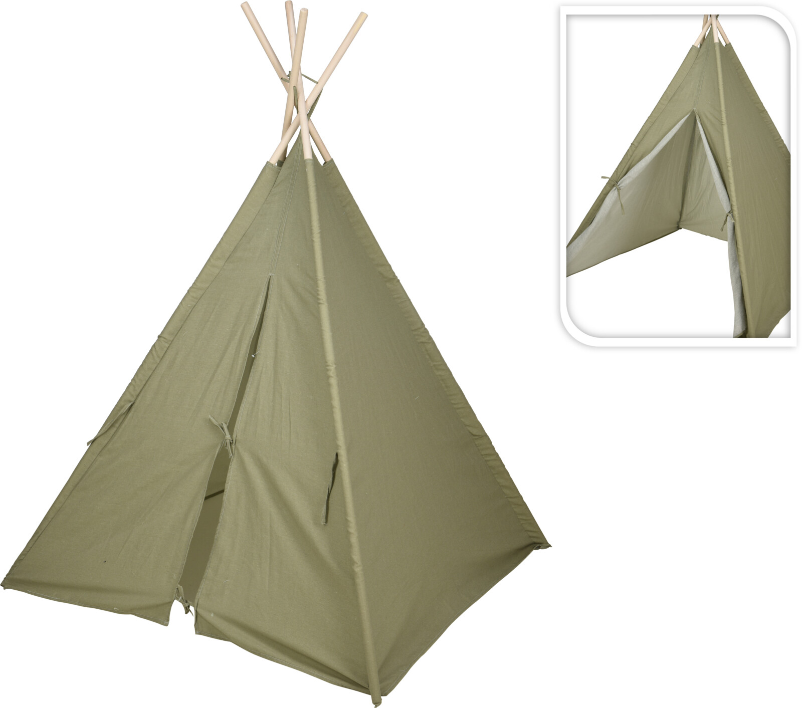 Cortul Teepee în nuanță verde olive este perfect pentru a crea un spațiu personalizat de joacă și relaxare pentru copii. Acest design natural și rafinat aduce un plus de confort și stil în camera copilului sau în grădină.