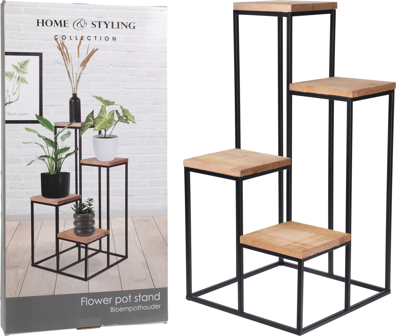 Expune-ți plantele preferate într-un mod elegant cu suportul etajat pentru ghivece de flori Home & Styling. Designul modern în trepte, realizat din structură metalică solidă și blaturi din lemn natural, oferă stabilitate și un aspect rafinat, potrivit pentru orice colț al casei, terasă sau balcon. Cele patru niveluri permit amplasarea mai multor plante decorative, economisind spațiu și creând un decor armonios. Ideal pentru plante suculente, orhidee, plante verzi sau decorațiuni.