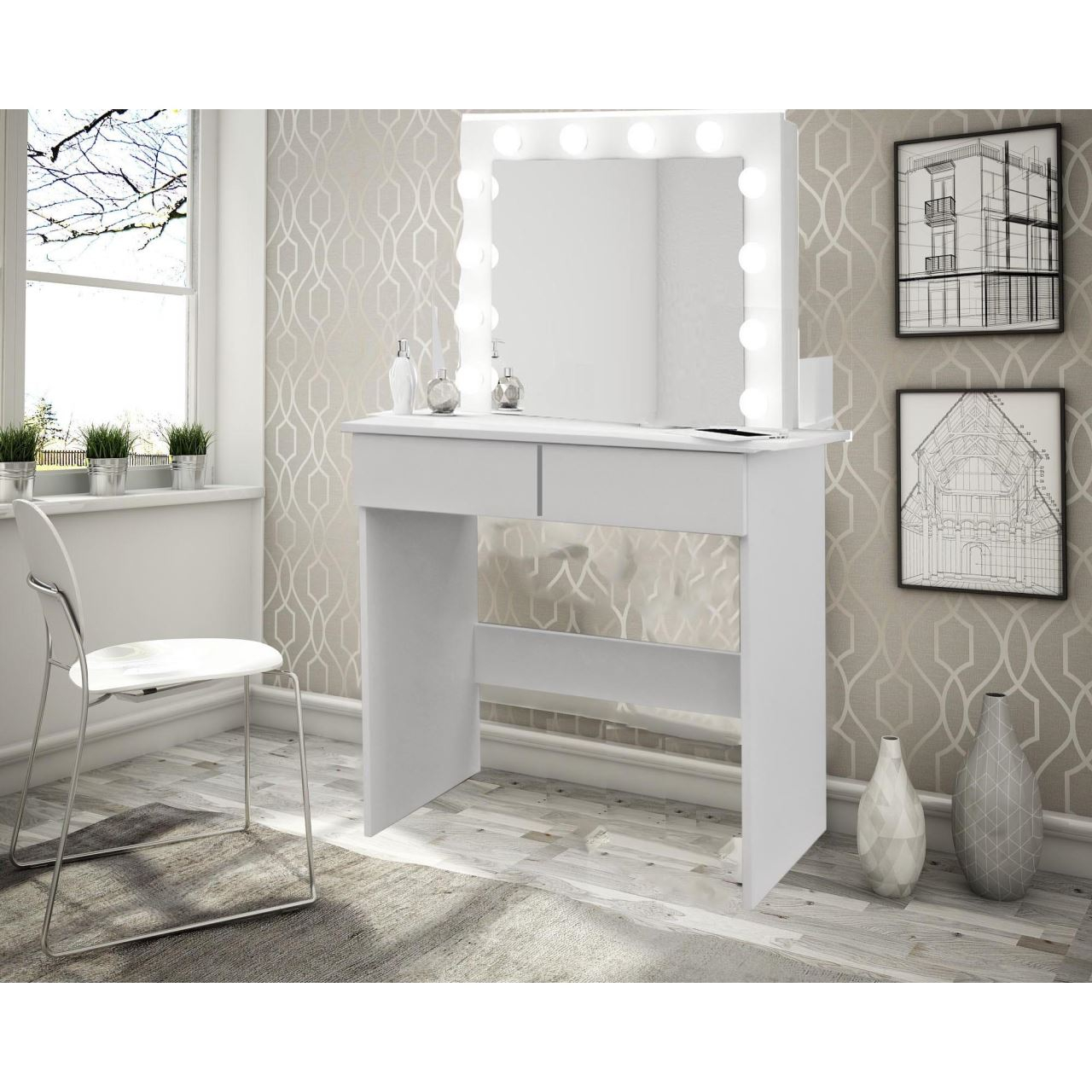 Masa de toaleta alba pentru machiaj cu oglinda si 12 leduri este cu siguranta visul oricarei femei.