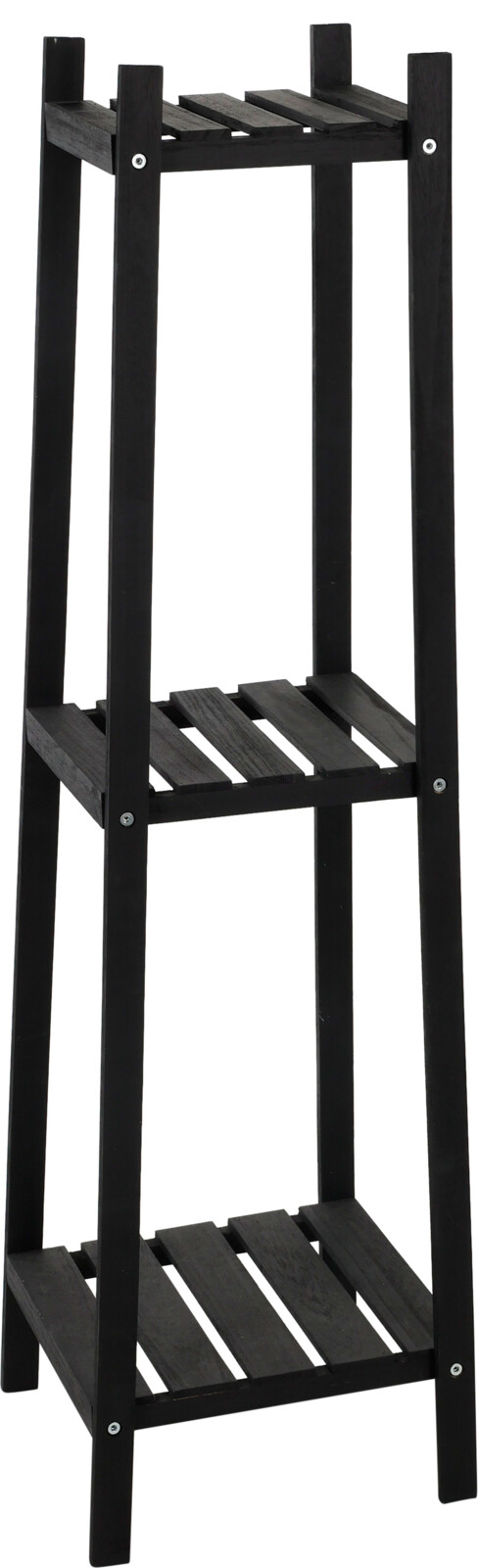 Etajeră din lemn cu 3 niveluri, de culoare neagră, ideală pentru organizare și decor în diverse încăperi. Designul său compact și elegant o face perfectă pentru utilizare în baie, hol, bucătărie sau living, oferind spațiu suplimentar pentru depozitare.
