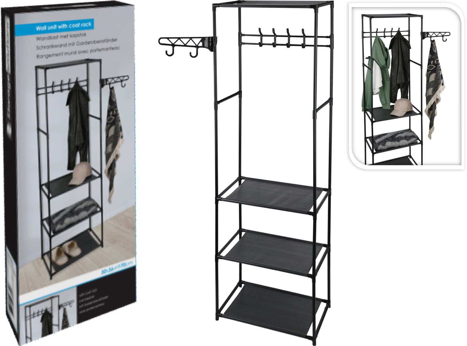 Cuier multifuncțional cu rafturi, perfect pentru organizarea hainelor, accesoriilor și încălțămintei într-un spațiu compact și bine structurat. Fabricat dintr-un cadru metalic rezistent, acest cuier oferă atât cârlige pentru agățat haine, cât și rafturi pentru depozitare.