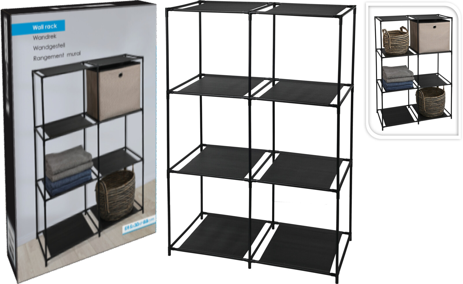 Raft modular cu 8 compartimente, ideal pentru organizarea eficientă a spațiului din locuință. Acest raft cu structură metalică robustă și rafturi textile este potrivit pentru depozitarea hainelor, accesoriilor, cărților sau altor obiecte, fiind ușor de integrat în living, dormitor, birou sau dressing.